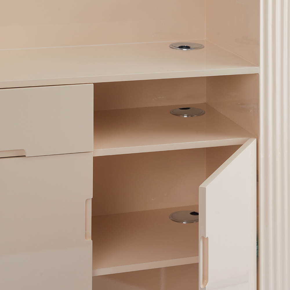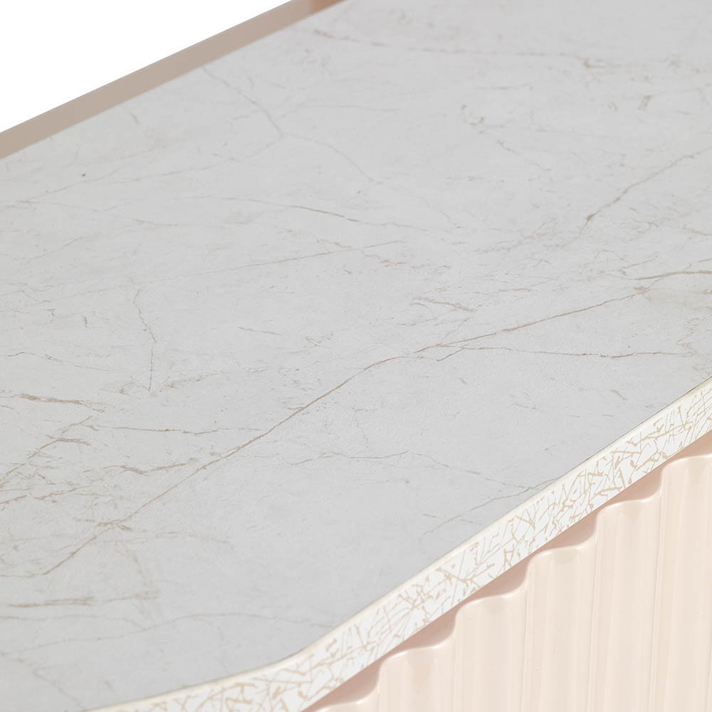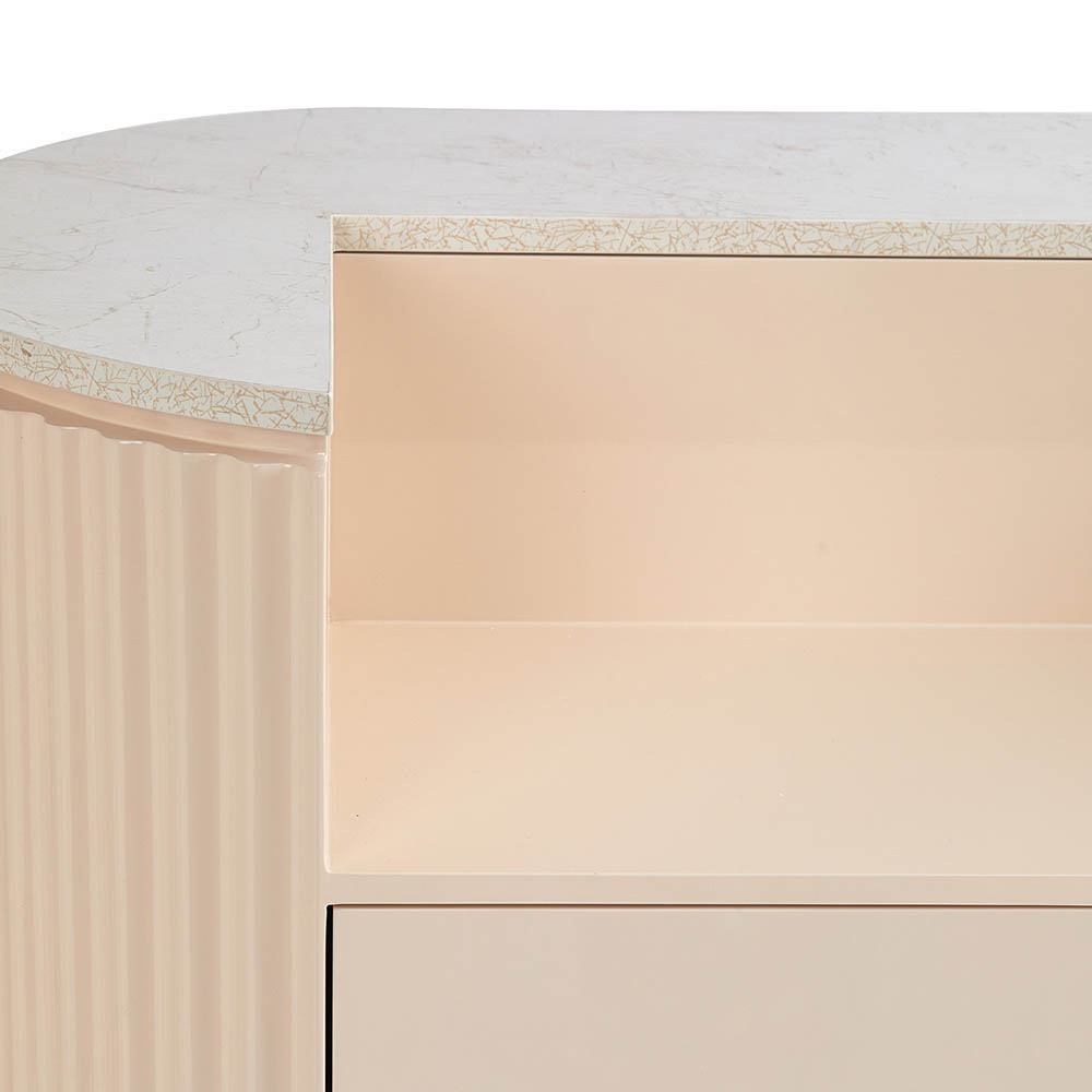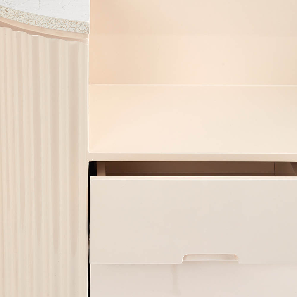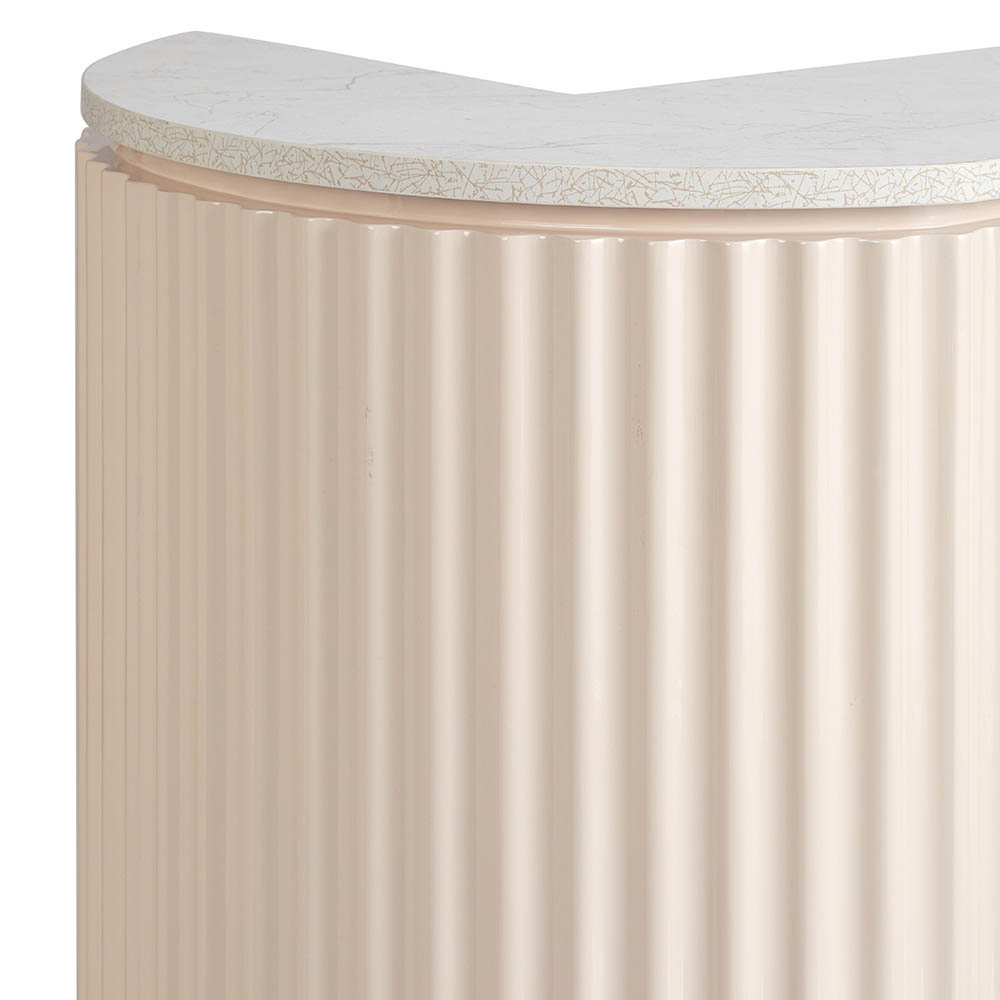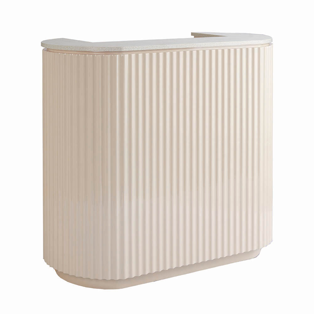 Get swept up in the ripple wavy details that dance across the glossy creamy surface, echoing the vivacity of a delightful cocktail. A gold marble vein textured bench top elegantly crowns the desk, adding a layer of luxe to your salon’s entrance.