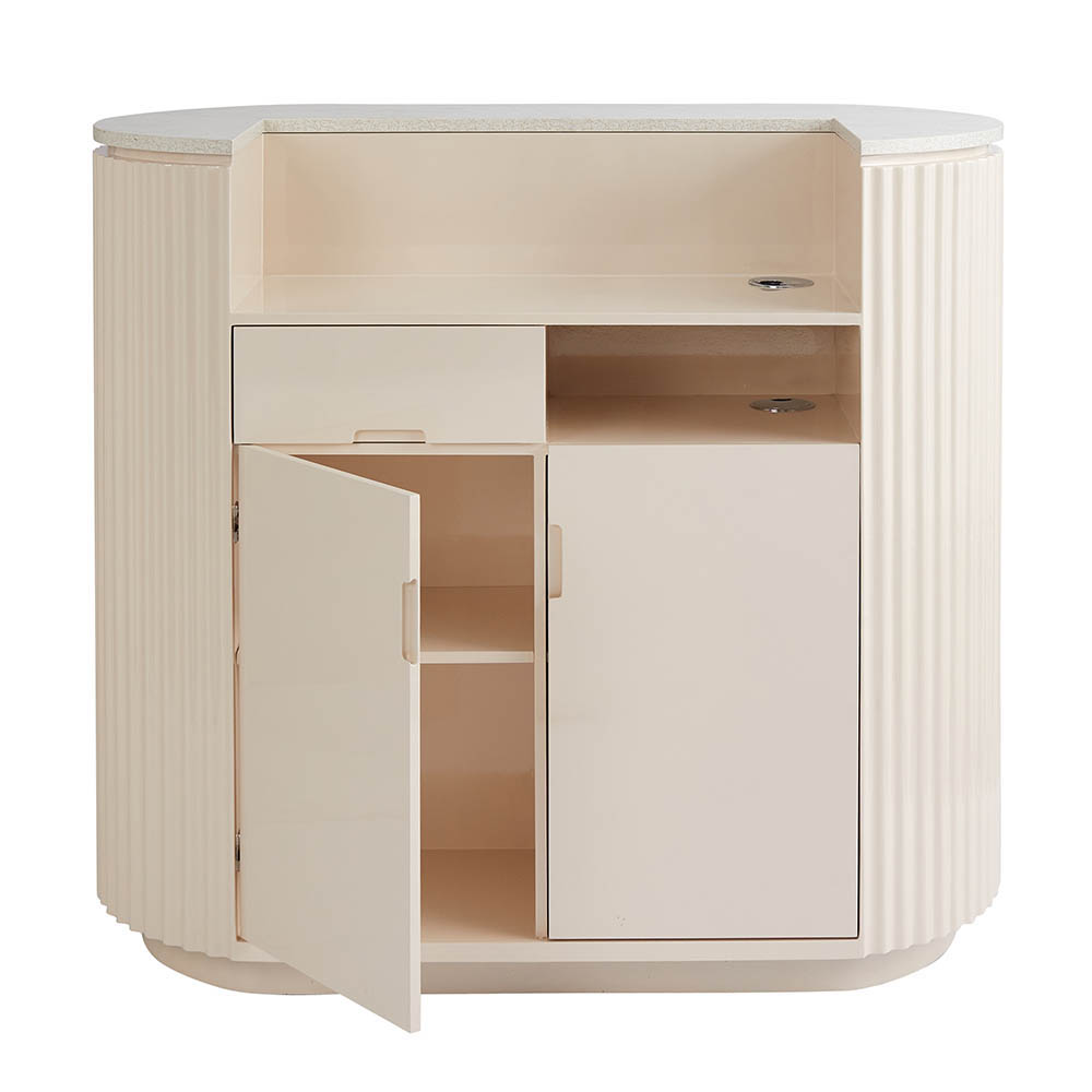 Meet Martini, a fusion of sleek curves and practical design by our in-house Comfortel team. This reception desk is a contemporary muse with a clean, wavy design in gloss cream pink finish. But Martini isn’t just a pretty face. With ample storage space, a discreet cash drawer shelf, and a front privacy panel, it keeps your salon essentials organized and accessible. Compact yet functional, Martini is perfect for smaller spaces, making a statement without demanding too much room. With Martini, your salon can effortlessly impress. Cheers!