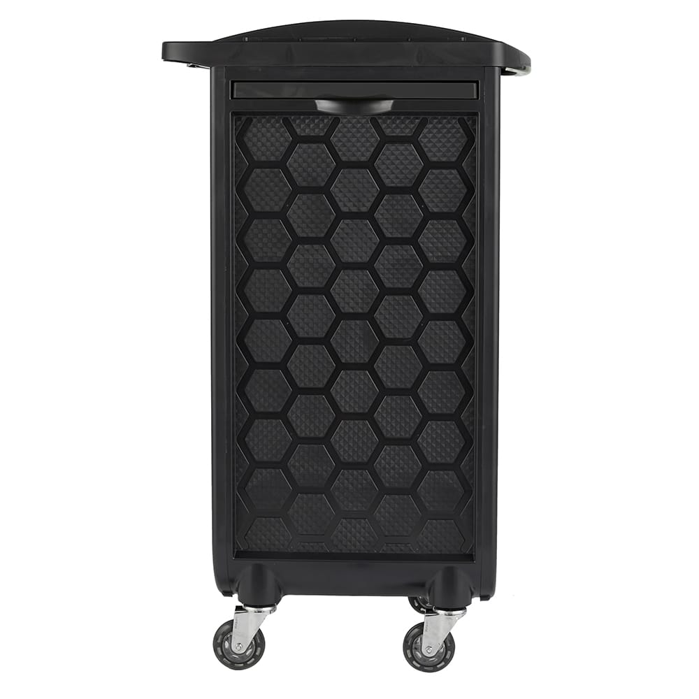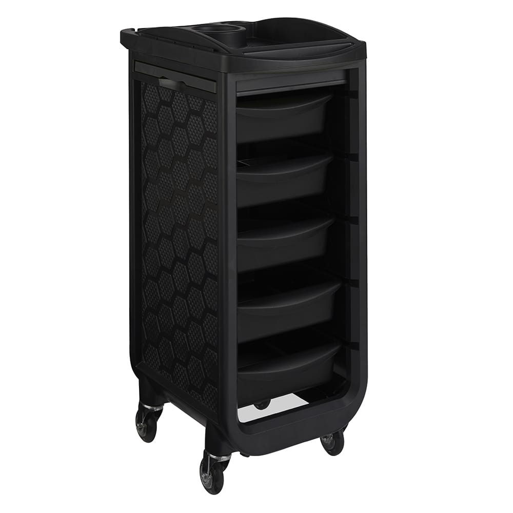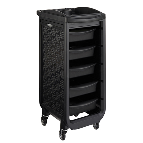 This hairdressing trolley in a smart black finish features 5 spacious sliding drawers that can be accessed from either side. It features a slide out accessories tray and tint bowl holder, as well as a bottle tray and blow dryer holder.