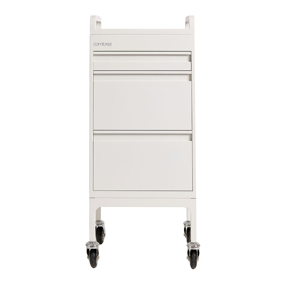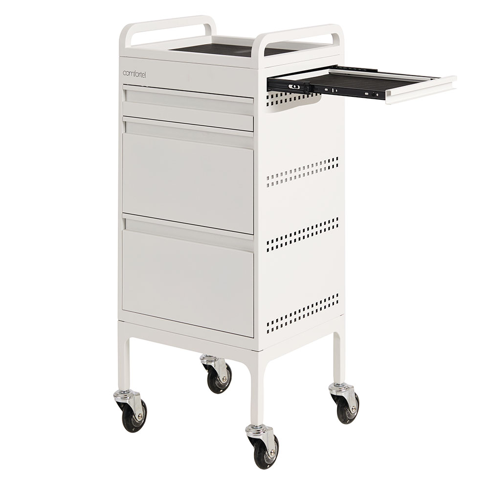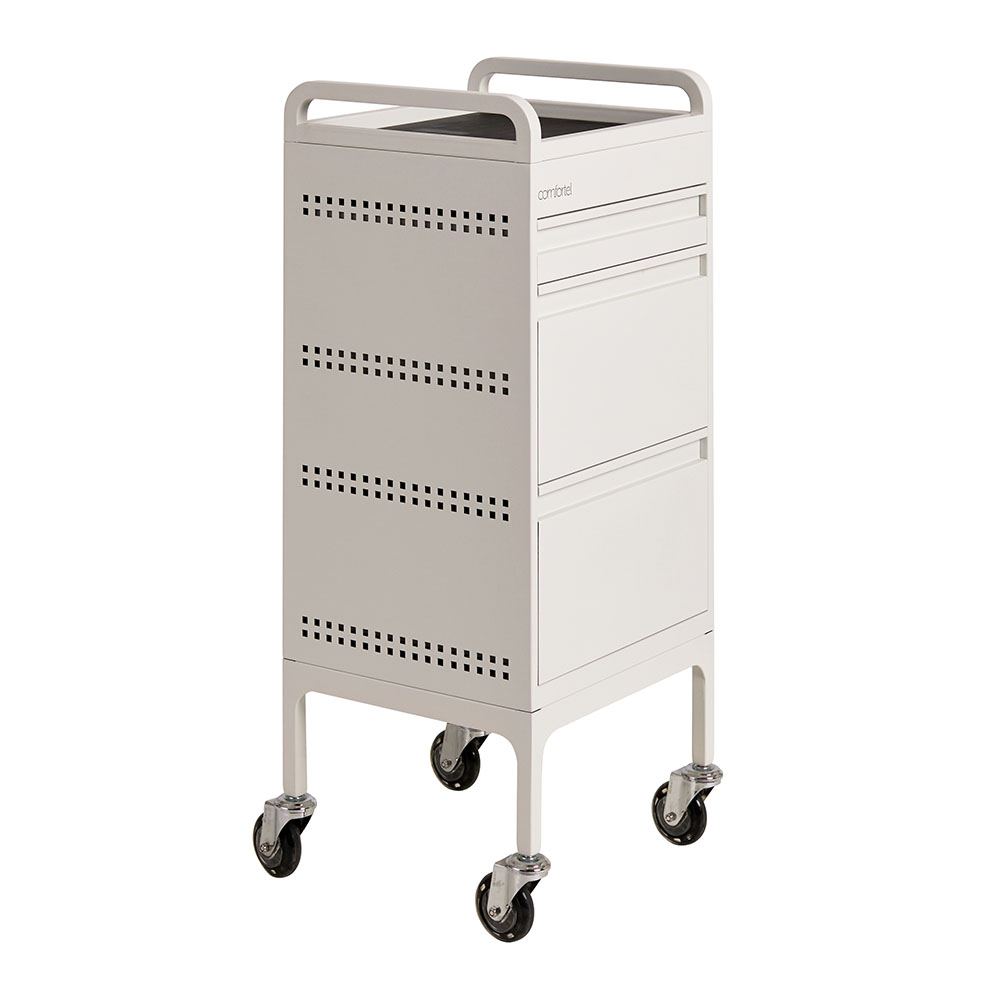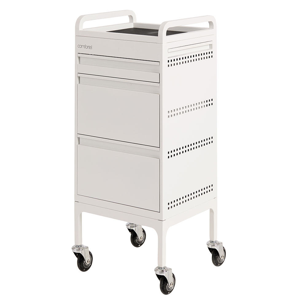 For the lovers of minimal and sleek clean lines. Designed by the team at Comfortel, this hairdressing trolley in a matte white metal finish features 3 spacious drawers as well as an extra slide out draw for workspace. This full metal powder coated salon trolley comes with handles, a roomy top tray, removable heat proof mat as well as Comfortel’s signature Hair Repellent Wheels. An extra bonus: the matte white metal is stain resistant*. This means hair dye can be wiped away using everyday household cleaner.