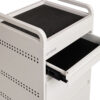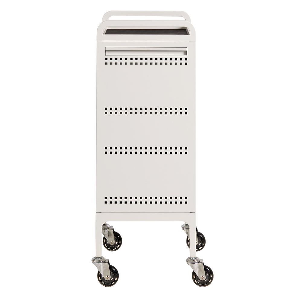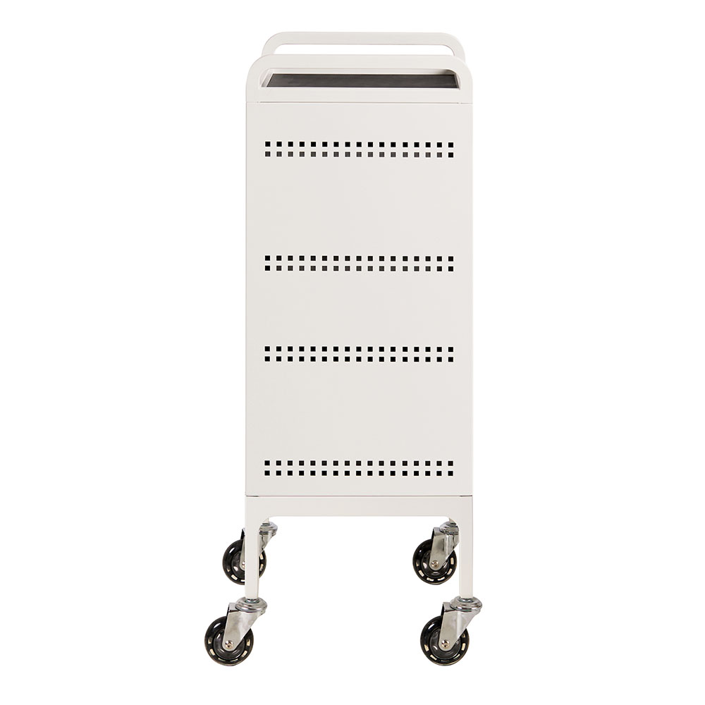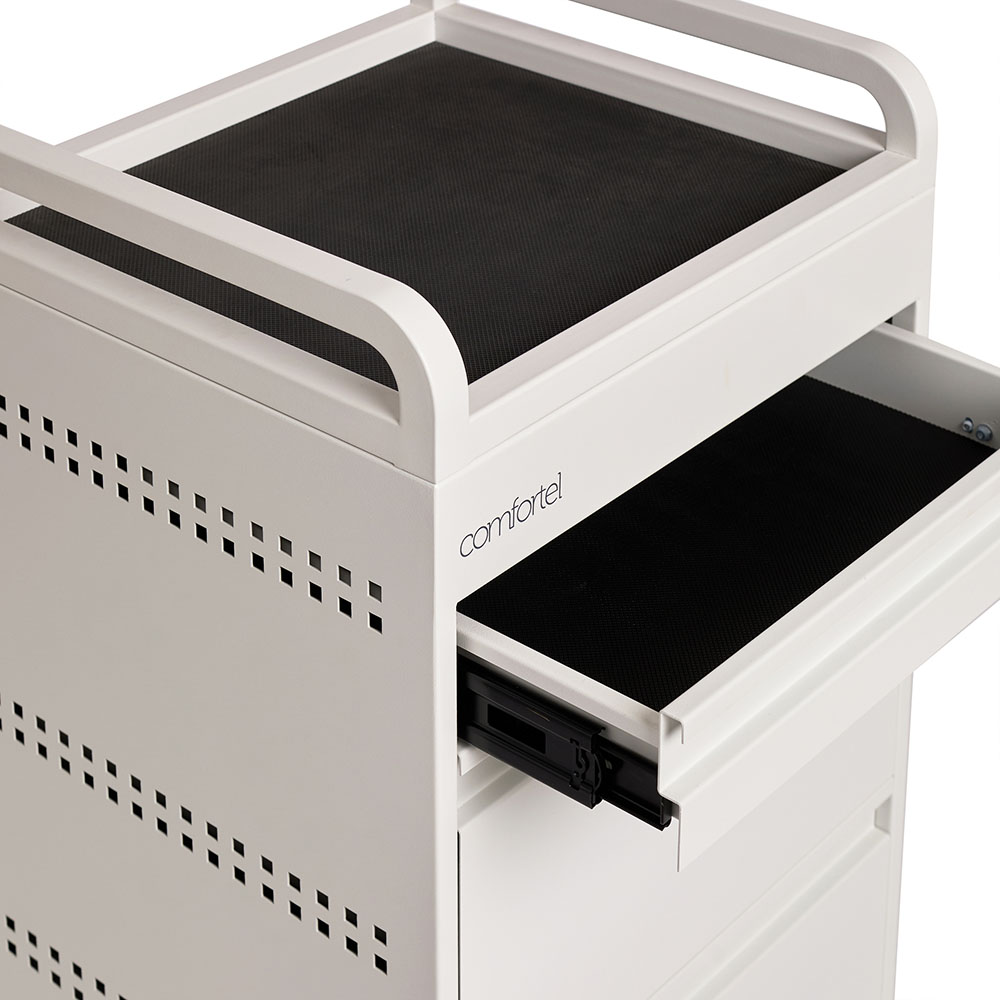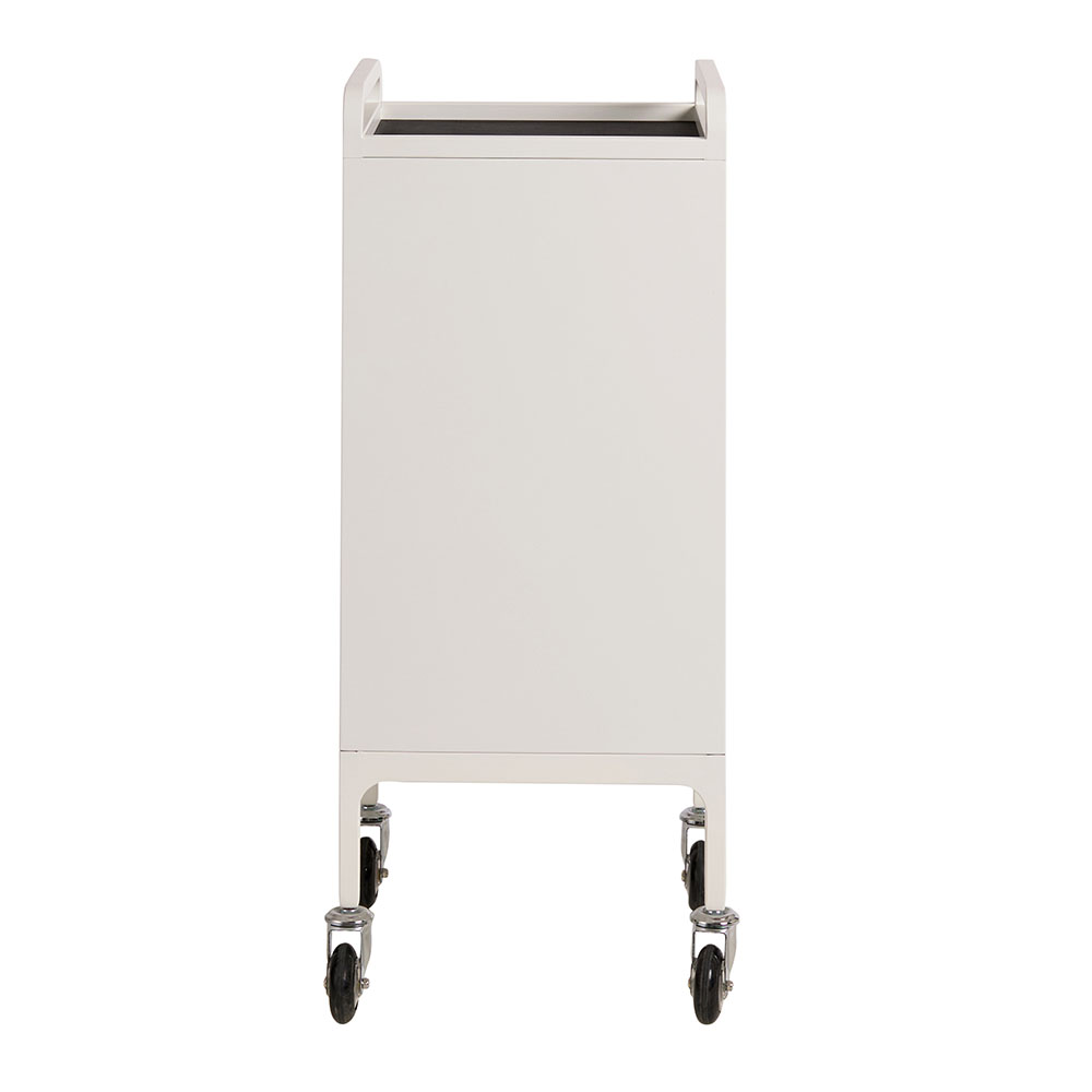 For the lovers of minimal and sleek clean lines. Designed by the team at Comfortel, this hairdressing trolley in a matte white metal finish features 3 spacious drawers as well as an extra slide out draw for workspace. This full metal powder coated salon trolley comes with handles, a roomy top tray, removable heat proof mat as well as Comfortel’s signature Hair Repellent Wheels. An extra bonus: the matte white metal is stain resistant*. This means hair dye can be wiped away using everyday household cleaner.